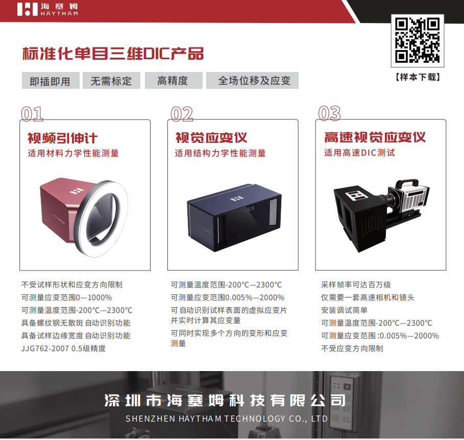深圳市海塞姆科技有限公司是一家以机器视觉技术为核心的国家级高新技术企业,自成立以来一直坚持全自主知识产权研发,并致力于将先进的机器视觉技术赋能应用于传感器领域,目前已成为技术领先的DIC视觉传感技术方案提供商。以“点亮机器的眼睛”为使命,海塞姆科技将前沿的机器视觉技术突破性的应用于材料力学性能测试、结构强度分析、安全检测及监测、工业在线测量等领域,陆续发布了视频引伸计、视觉应变仪等多款产品。