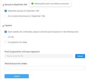 After creating an account on the website, you'll need to click ‘Register’ under ‘Registration’ item on the top again to continue the registration process, the second step ('Fill in the attendance information') in 'Registration' process will lead you to fill in your attendance information including name, affiliation, email address, and phone number; selecting the format of attendance (in-person or virtual); selecting whether to attend the banquet on September 18th or not; selecting the registration fee payment method from one of the three options: Bank Transfer (please check 'Payment' item for details), On site, and No payment if on virtual; and filling in the WeChat Account information if you have one and are willing to share it. After the above process, please click the 'Submit' button with blue background color at the bottom of the page to submit your attendance information.