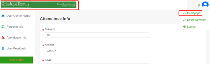 You can click the green Grassland Research journal banner on the left top corner or the first item ('Homepage') in the drop-down list of avatars in the top left corner to go back to the homepage of the website.
